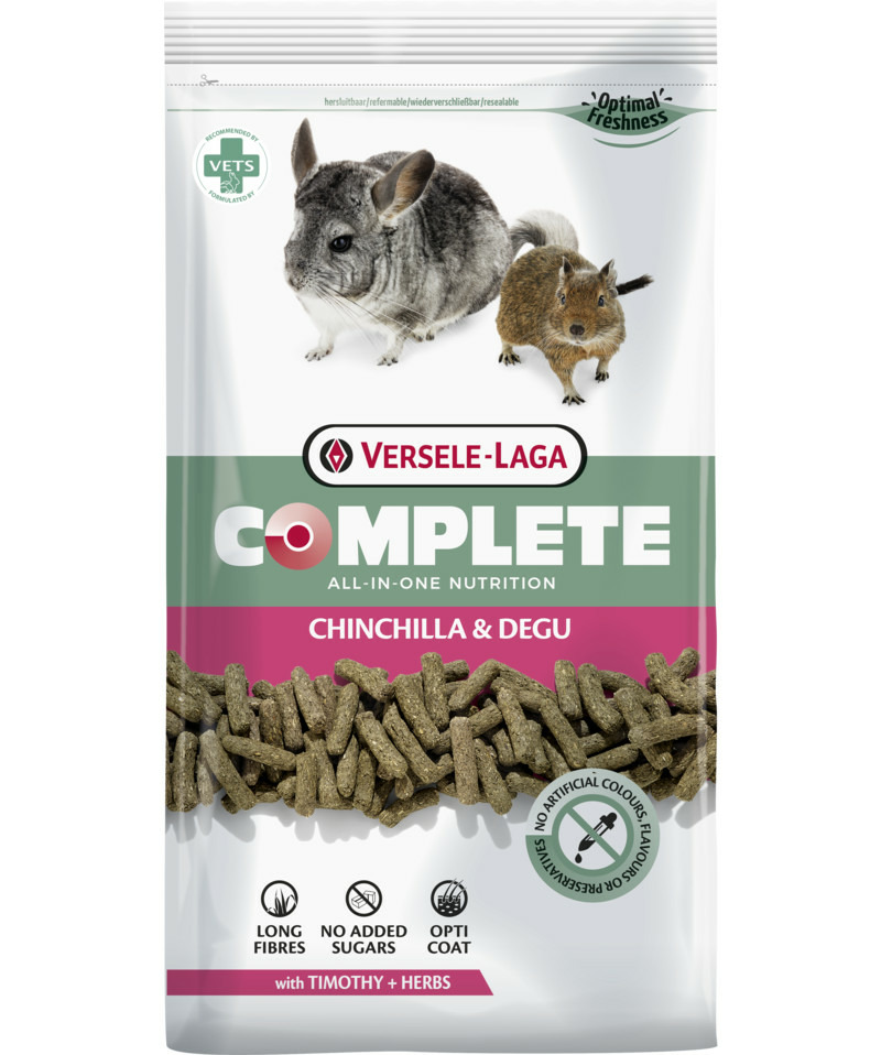 Versele-Laga Complete Chinchilla & Degu est un aliment sans souci. Les délicieux granulés tout-en-un évitent le comportement alimentaire sélectif. De cette façon, votre chinchilla ou octodon reçoit tous les nutriments essentiels et pourra-t-il rester en parfaite santé. L'aliment sans sucre ajouté permet à vos animaux de conserver leur vitalité et de rester dans une forme optimale. Les graines de lin, comme source d'oméga-3 pour un pelage sain, et les fibres longues, pour un système digestif optimal, ont été spécifiquement adaptées aux besoins nutritionnels des chinchillas et des octodons. Versele-Laga Complete Chinchilla & Degu a été développé par des vétérinaires, qui se sont basés sur des connaissances scientifiques de pointe.