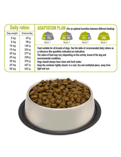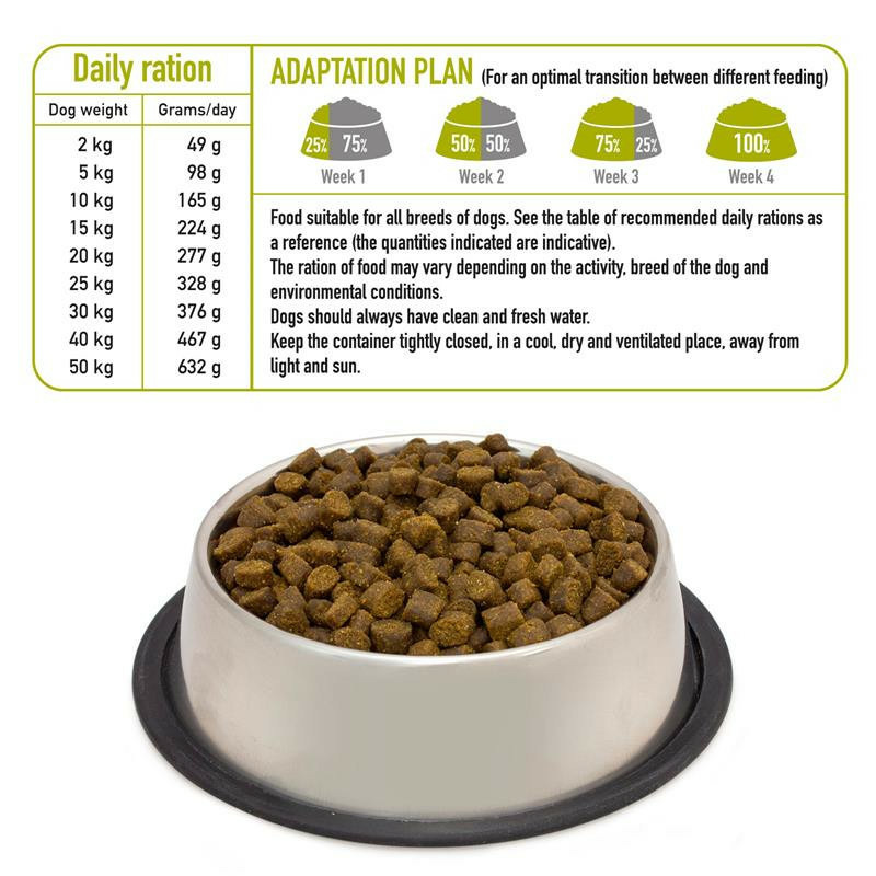 Aliment complet semi-humide pour tous les types de chiens adultes, avec 55% de porc frais, 20% de poisson frais et 25% de légumes, fruits et herbes médicinales.
