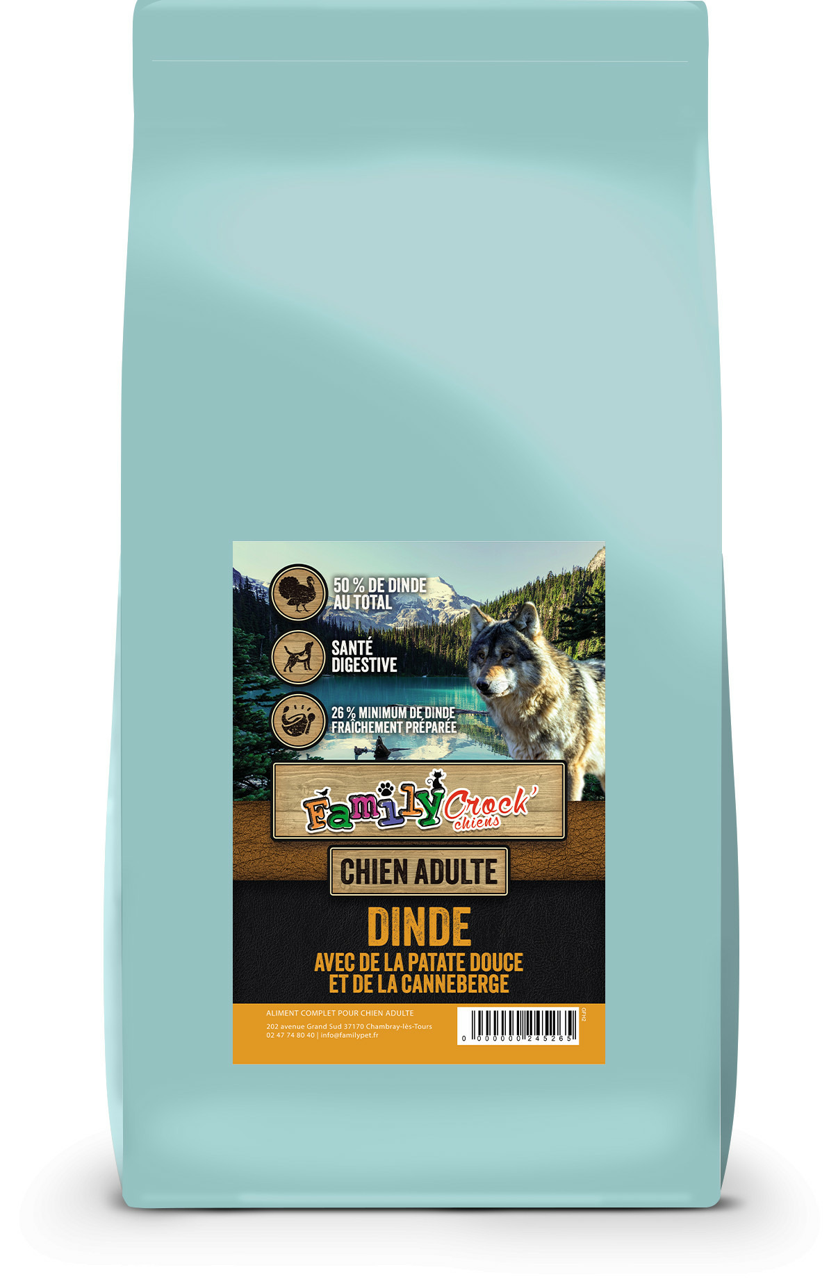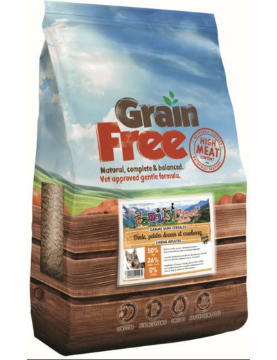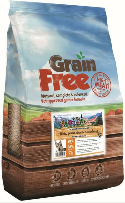 Composition : Dinde 50 % (avec 28 % de dinde fraîchement préparée, 20 % de dinde déshydratée et 2 % de bouillon de dinde), patates douces (26 %), petits pois, pommes de terre (6 %), pulpe de betterave, graines de lin, supplément d'oméga 3, vitamines et minéraux, bouillon de légumes, canneberges (équivalent de 7,5 g par kg de produit), FOS (92 mg/kg), MOS (23 mg/kg).