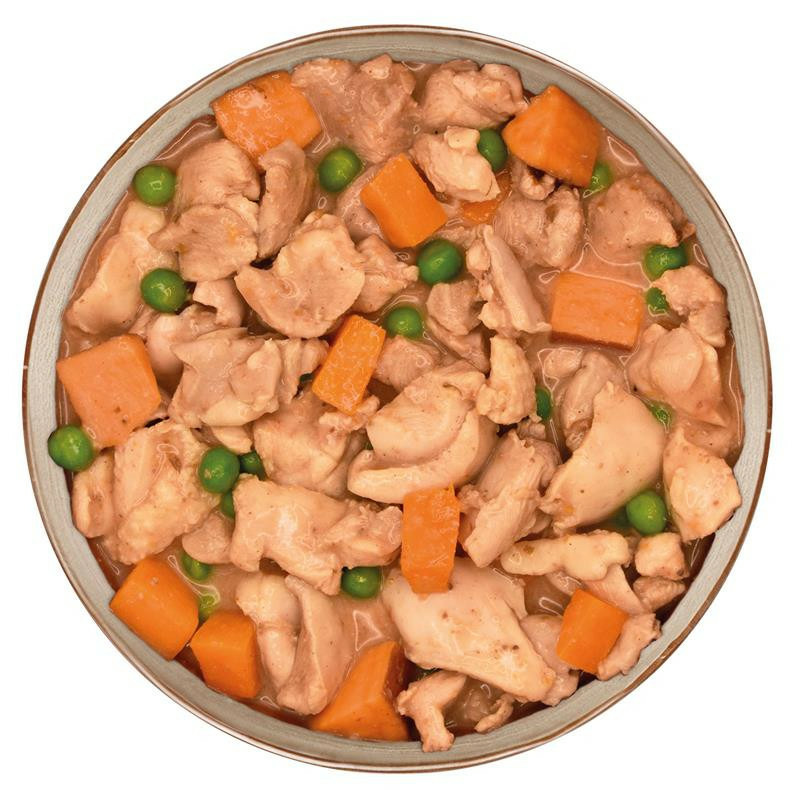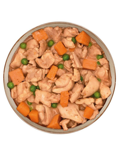 Composition : 97% poulet frais dans sa sauce, patate douce, petits pois, carotte, épices.
