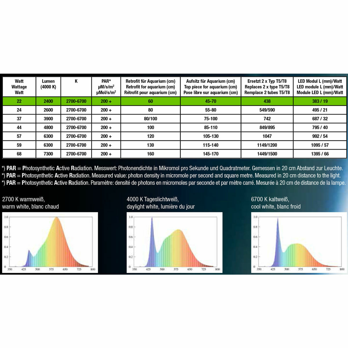 Le spectre lumineux nécessaire aux plantes d'aquarium est très différent de celui d'une pièce d'habitation ou d'une lampe de poche à led. Il s'agit ici du rayonnement photosynthétiquement actif, appelé PAR (Photosynthetic Active Radiation), et d'un spectre complet qui englobe TOUTES les plages spectrales du spectre de la lumière visible. Ce n'est qu'à partir de ces deux composantes que l'on a pu produire une lumière parfaite pour les plantes d'aquarium !