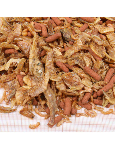• Contient des puces d'eau (env. 1 cm) délicatement séchées, des crevettes (env. 3 cm), des poissons (max. 9 cm) et des bâtonnets à base de poisson (env. 1,5 cm) pour une alimentation naturelle et variée.