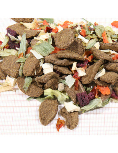 Composition : poivron, carottes, farine de luzerne, farine de germes de blé, fibres de pomme, semoule de blé, panais, poireau, betterave rouge, farine d'épinard, brocoli, pulpe de betterave séchée.