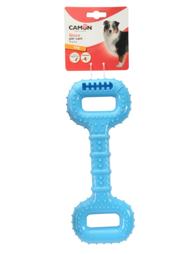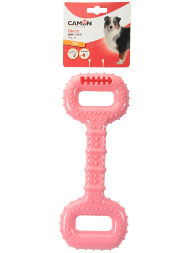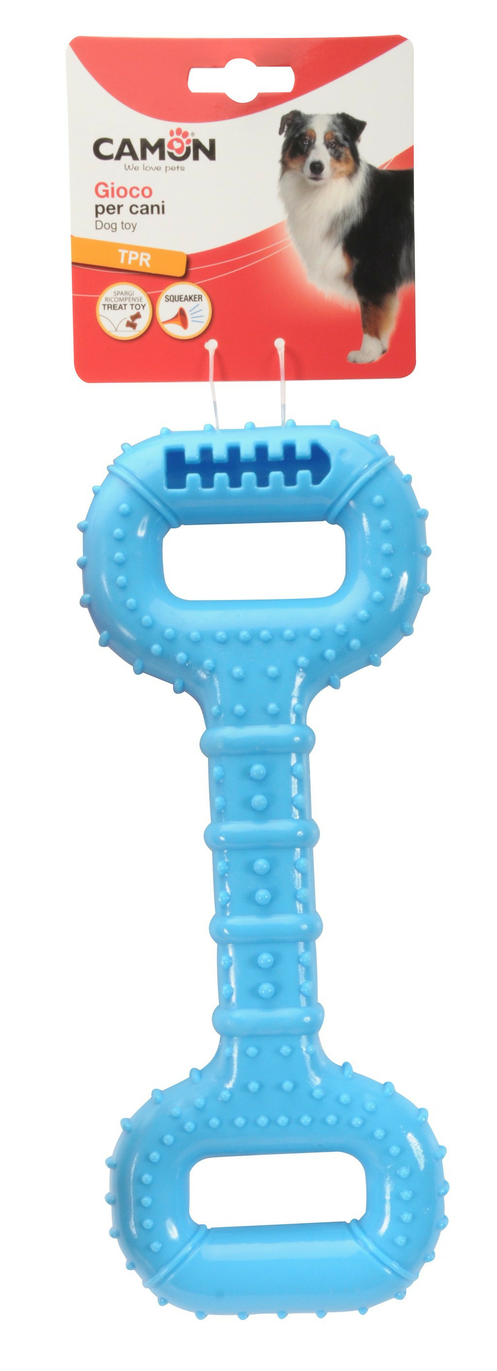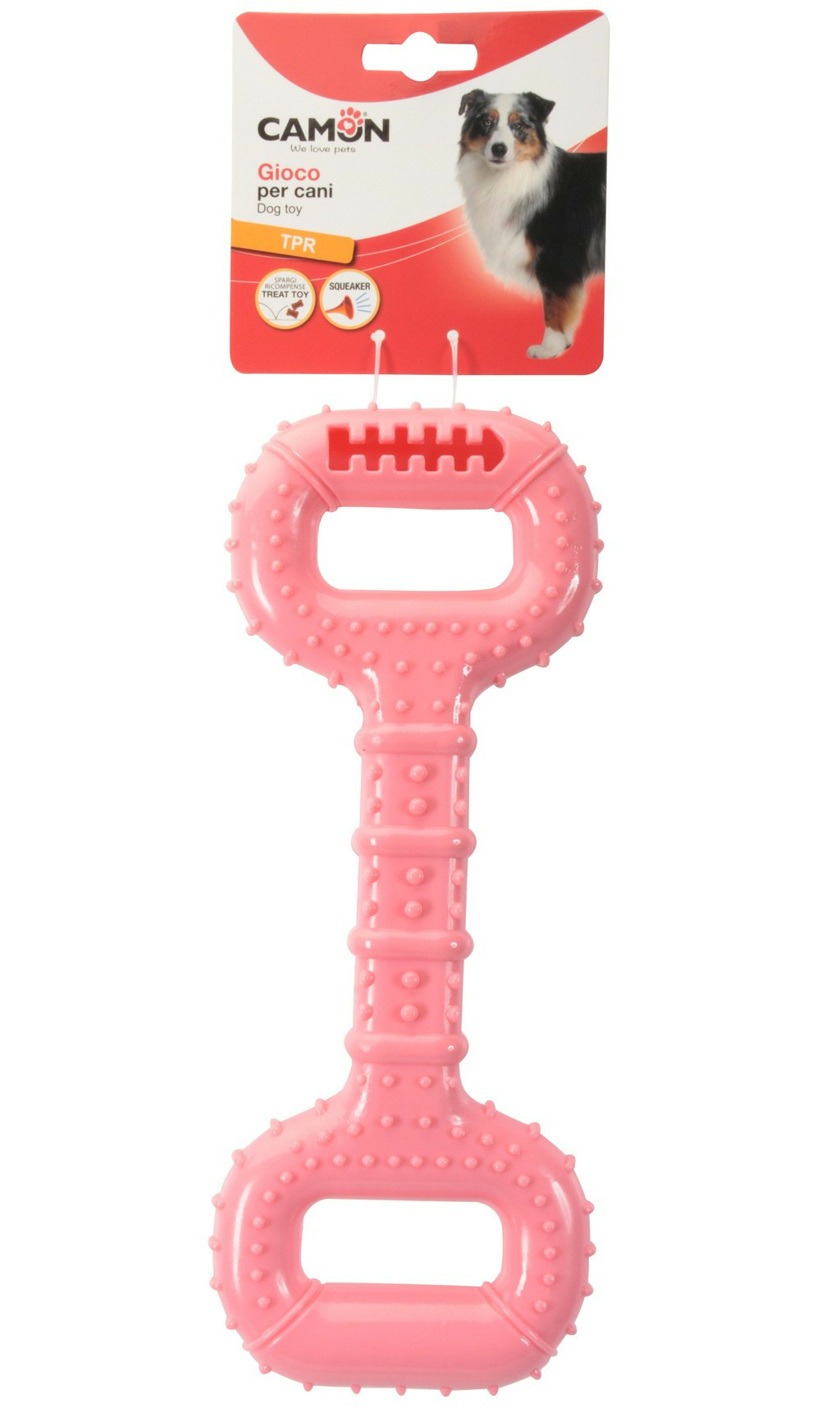 Utilisable également comme distributeur de friandises, il est muni de poignées et d'un couineur intégré.