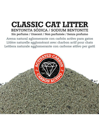 Litière agglomérante naturelle pour chats, enrichie en charbon actif.