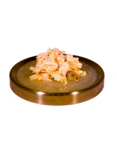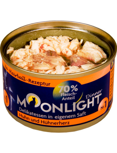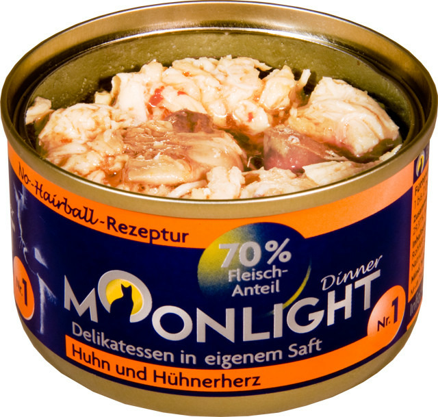 Ingrédients : 70% de viandes (soit 66.25% de poulet et 3.75% de coeur de poulet), 29.85% d'eau de cuisson, 0.15% d'oligosaccharides.