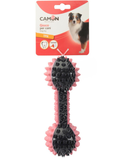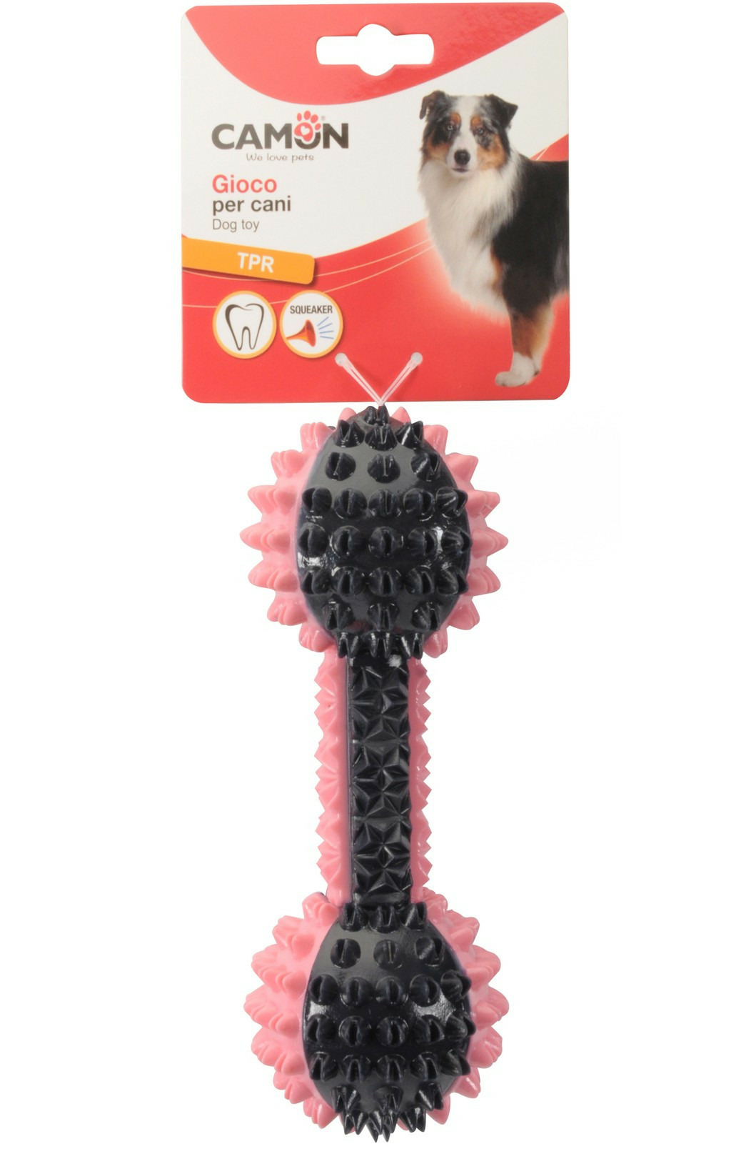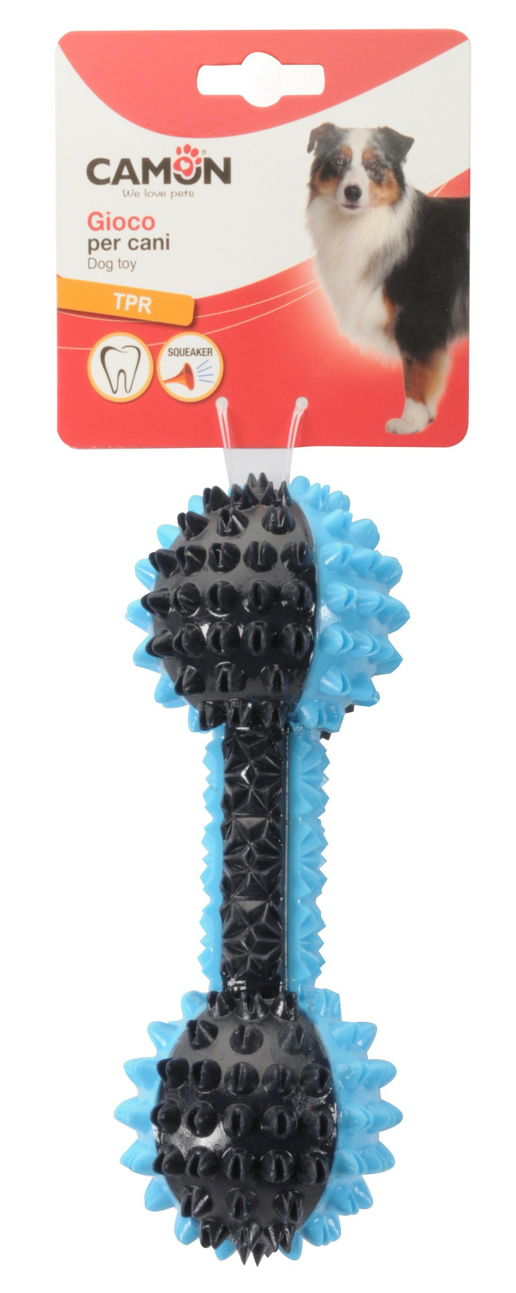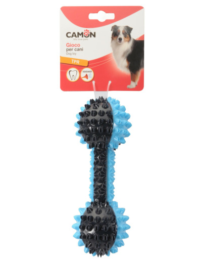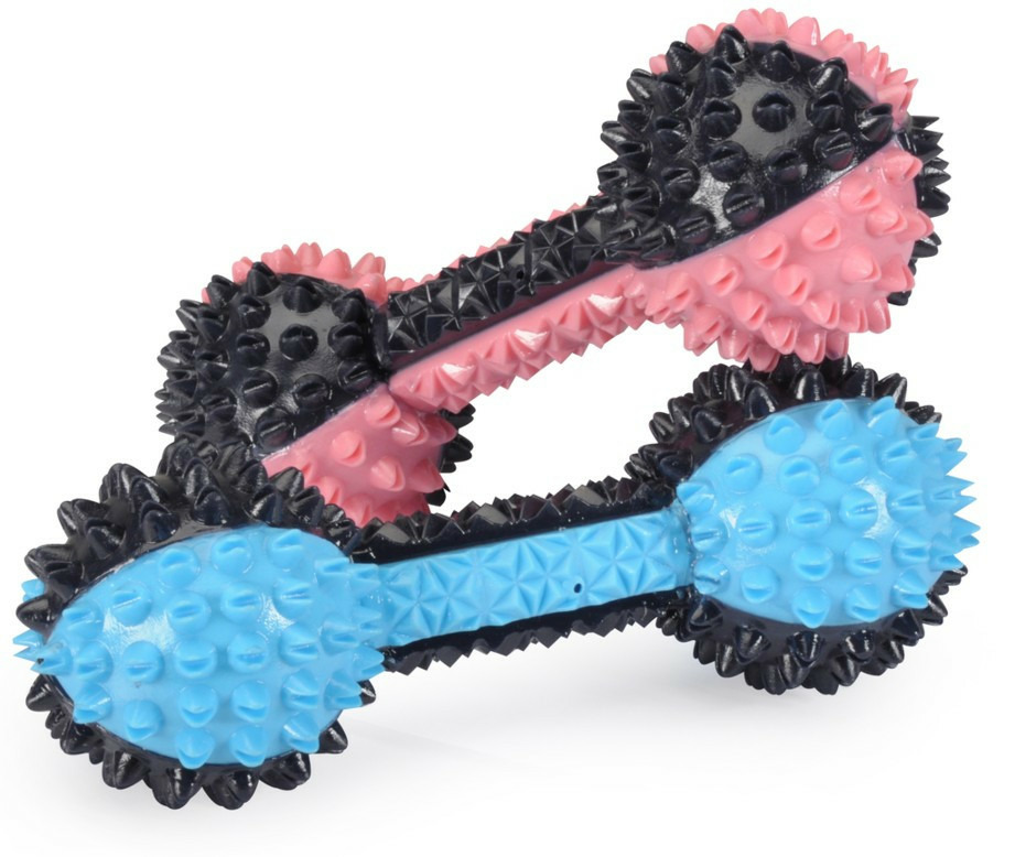 Jouet amusant pour chien en TPR en forme d'haltère bicolore à picots.