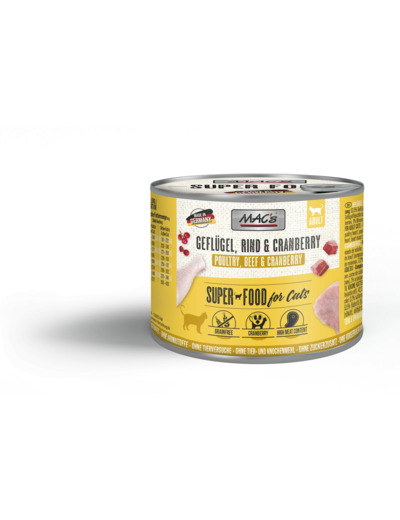 MAC's Cat Volaille & Canneberge est un aliment complet à une recette spéciale sans céréales. Canneberge a un effet positif sur la santé des voies urinaires de votre chat et peut aider à prévenir les maladies.