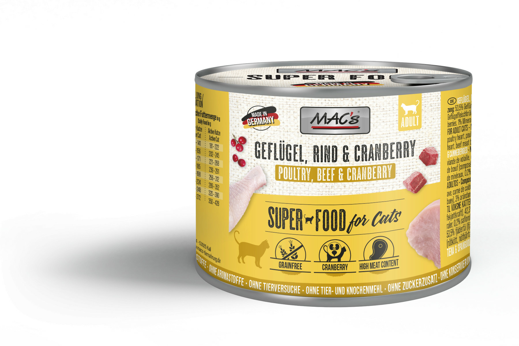 Préparé soigneusement avec l'ajout des vitamines et des minéraux, MAC's Cat Volaille & Canneberge assure une alimentation saine, équilibrée et harmonieuse pour votre chat favori.