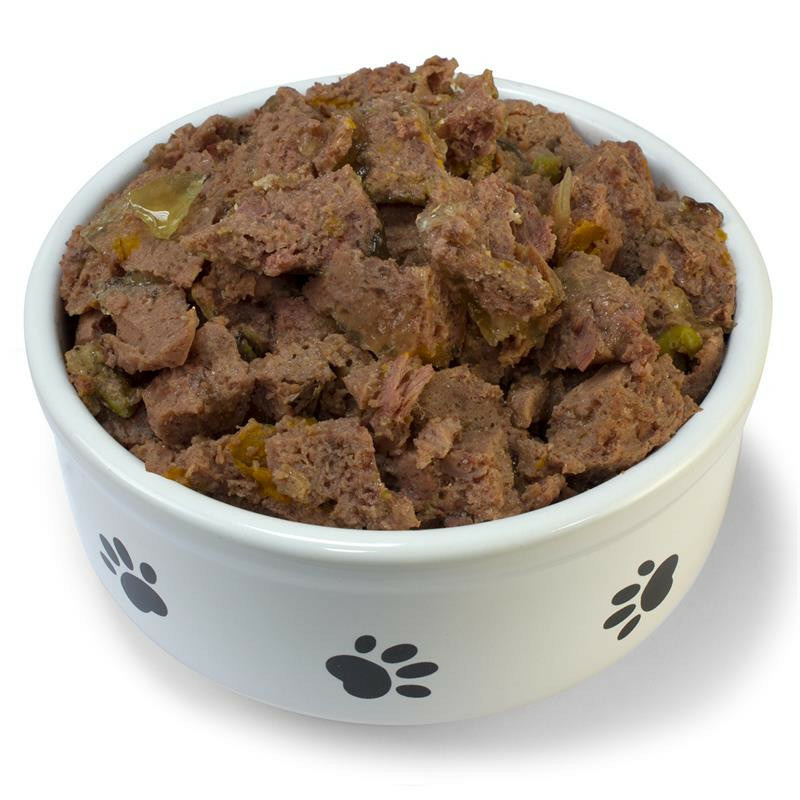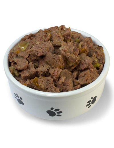 Composition: Poulet (viande, foies et cours) 91%, carottes 2%, petits pois 2%, huile de saumon 0,1%, minéraux, xylose.