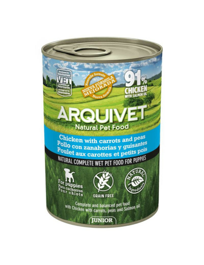 Aliment humide complète pour chiot. Fait avec du poulet avec des carottes, des pois et de l'huile de saumon. Ingrédients 100% naturels. Sans céréales.