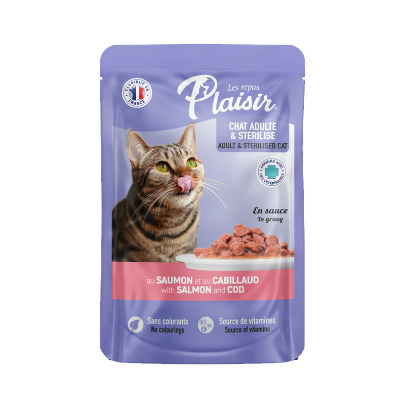 Les émincés en sauce Les Repas Plaisir au Saumon et au Cabillaud sont de savoureux repas complets pour votre chat: taux de protéine élevé, faible taux de matières grasses, sans colorants. Ils existent en 4 recettes et conviennent parfaitement aux chats stérilisés.
