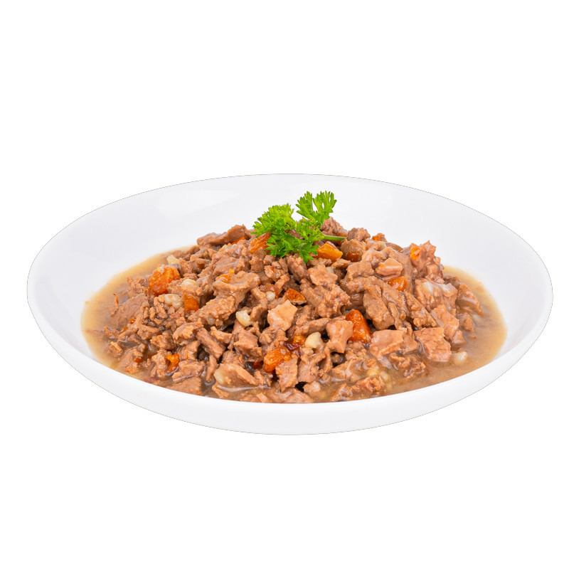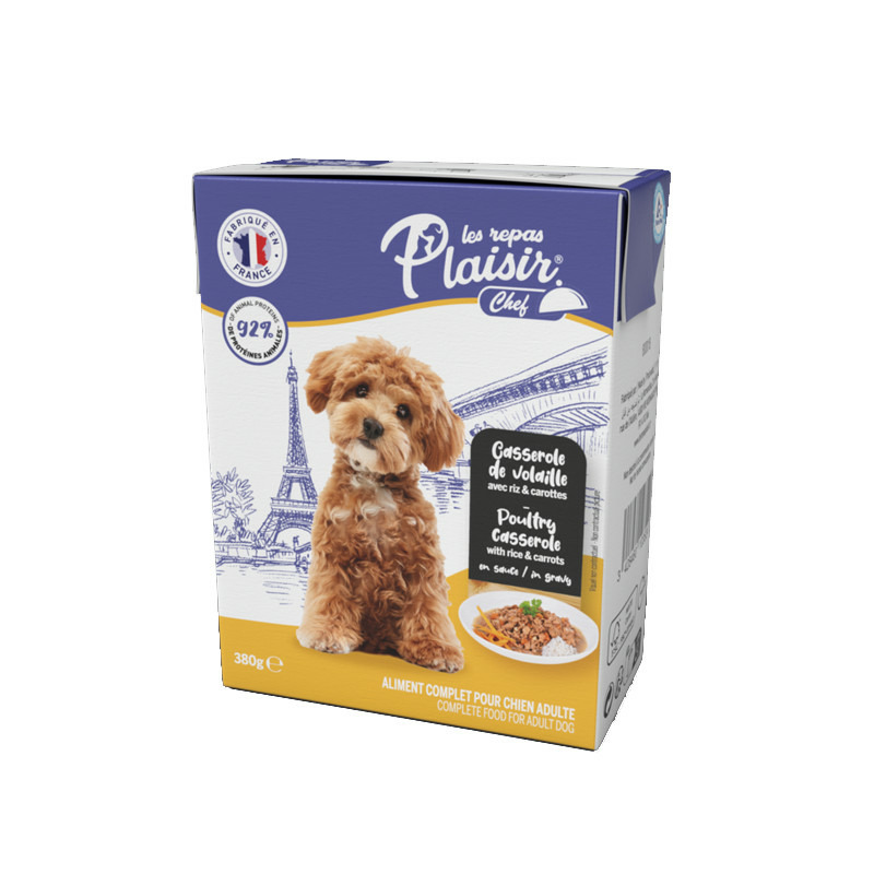 Une portion généreuse d'effilés en sauce avec plus de 30% de volaille et cuisinée avec du riz et des carottes. C'est la "blanquette" qui s'invite dans la gamelle de votre chien. Waouf !