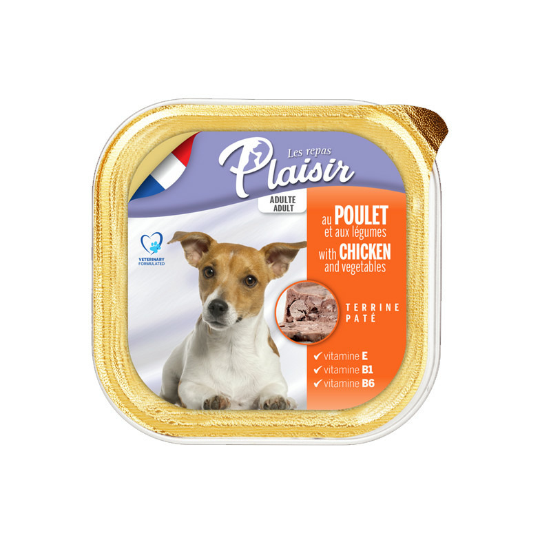 Les pâtés Les Repas Plaisir 300g pour chien adulte sont déclinées en 3 saveurs avec des légumes. Ils constituent de vrais repas complets pour votre animal: par exemple, 2 barquettes par jour de cette recette au Poulet avec des légumes suffisent à nourrir un chien adulte de 7kg. Fabriqué en France, sans colorants, ni céréales ajoutées.