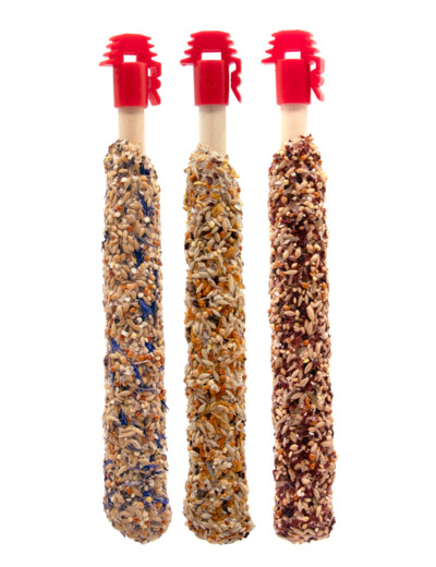 3 bâtonnets de graines cuits (super graines et fleurs, mélange de fruit et pissenlit, fruits rouges et menthe) pour canaris