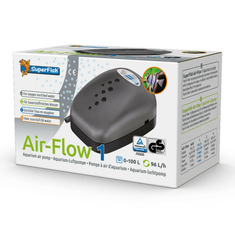 SUPERFISH Air-Flow 1 est une pompe à air équipée d'une sortie d'un débit de 96 l/h pour une consommation de seulement 2 Watts et qui sera adaptée pour tous les aquariums jusqu'à 100 litres maximum.