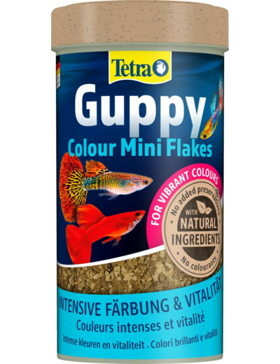 Aliment complet hautement nutritif contenant des activateurs naturels de couleur, pour l'alimentation quotidienne des guppys et autres vivipares. Mini-flocons renforçant l'éclat des couleurs des poissons.