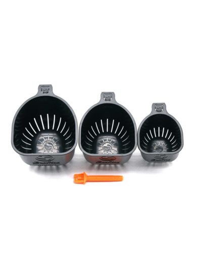 Leur fond percé. . é.vite aux appâ.ts de coller à. la coupelle, tandis que leur partie haute à. ouverture large permet un remplissage et un amorç.age plus faciles. Ces coupelles trè.s facilement interchangeables sont idé.ales pour des asticots, des pellets, de l'amorce .