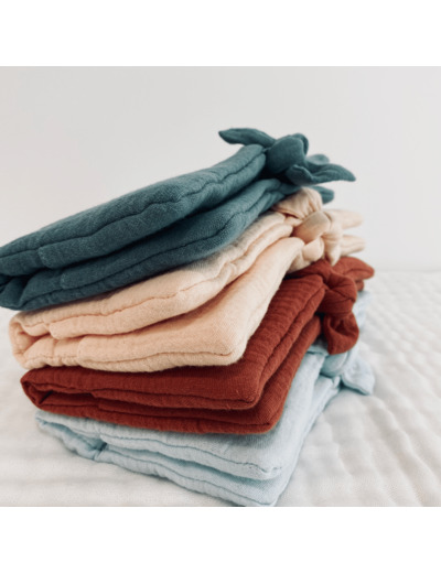 - marquage noir sur les couleurs bleu, pêche pastel et moutarde, marquage blanc sur les couleurs terracotta et émeraude