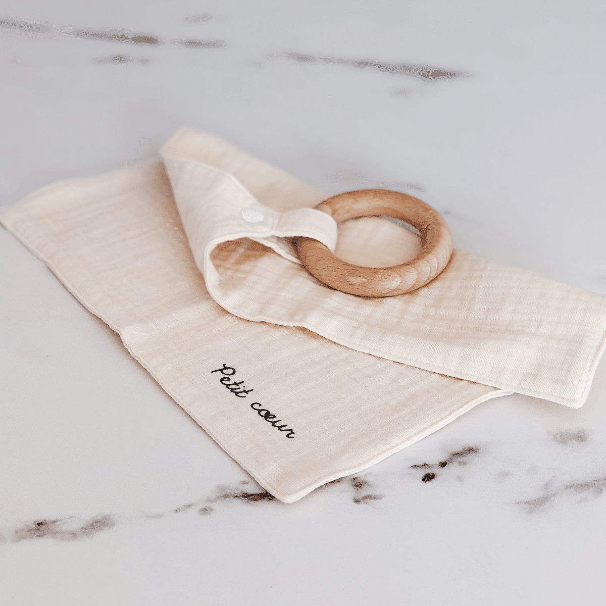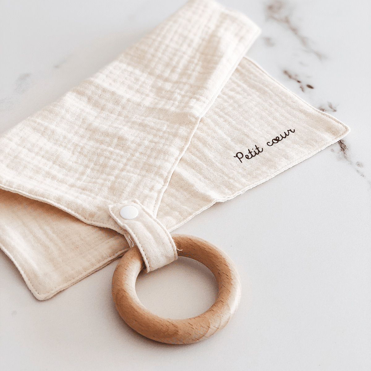 - bouton pression multi usage pour accrocher le lange doudou à bébé, ou y attacher la tétine ou l'anneau en bois.