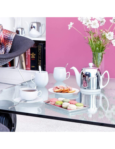 La théière SALAM 6 tasses est en porcelaine blanche, sa cloche est inox poli miroir. Livrée avec un infuseur amovible.