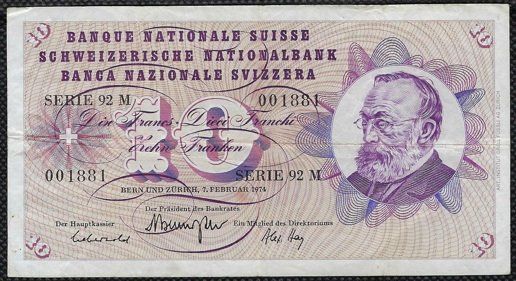 SUISSE 10 FRANCS / FRANKEN 7 FEVRIER 1974 Série 92 M TTB (W45u)
