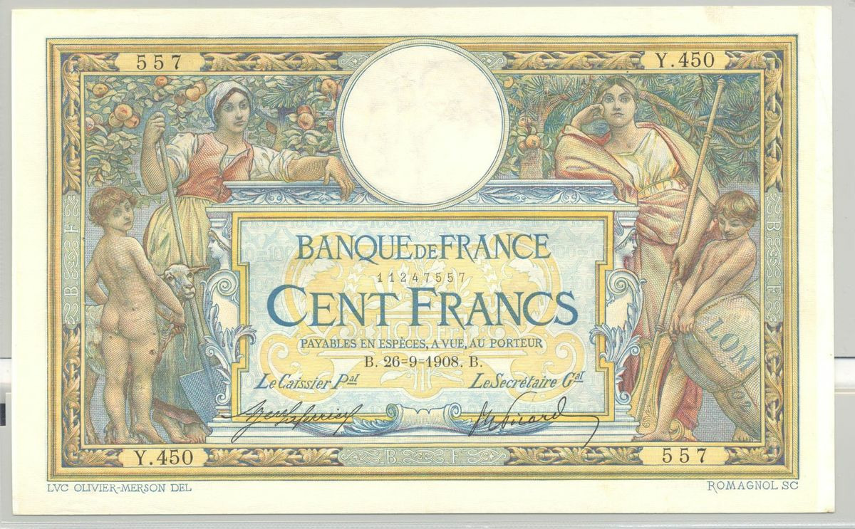 FRANCE 100 FRANCS L.O.M avec LOM SERIE Y.450 26-9-1908 TTB+