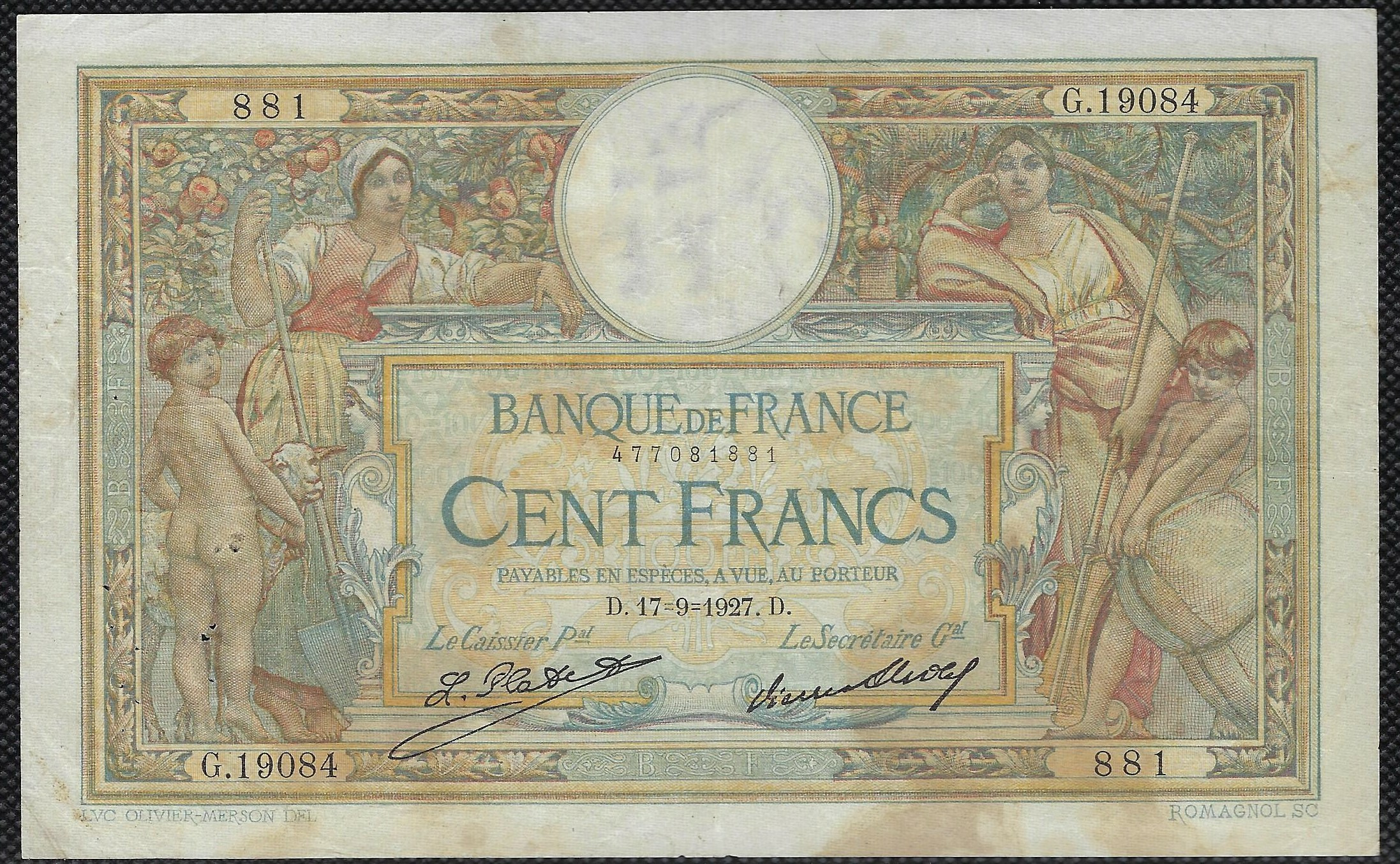 FRANCE 100 FRANCS MERSON sans LOM 17-9-1927 G.19084 TB+ (F24/06)
