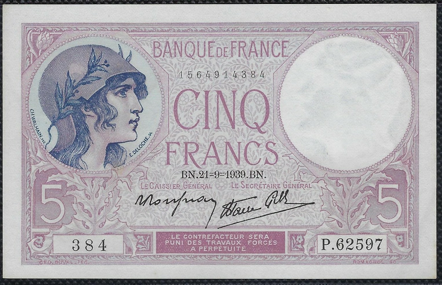 FRANCE 5 FRANCS VIOLET 21-9-1939 P.62597 SPL