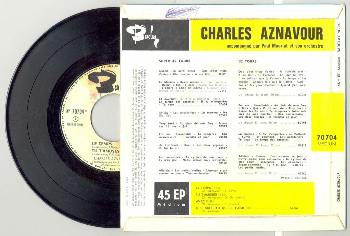 45 Tours CHARLES AZNAVOUR "LE TEMPS" / "AVEC"