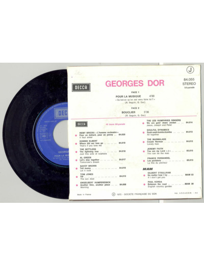 45 Tours GEORGES DOR "POUR LA MUSIQUE" / "BOUCLIER"