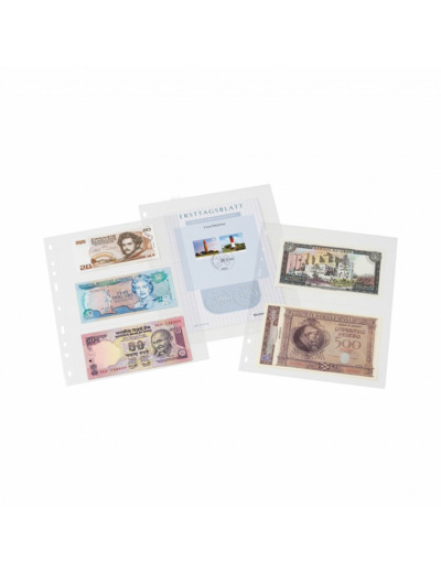 Les feuilles transparentes en plastique LEUCHTTURM avec compartiments différents sont idéales pour ranger par exemple des billets de banque, des cartes en format A6 et tous les types de documents jusqu'au format de 245 x 180 mm (> format A5).