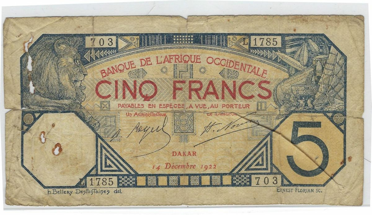 B.A.O. BANQUE DE L'AFRIQUE OCCIDENTALE( DAKAR ) 5 FRANCS 14-12-1922 SERIE L1785 B+