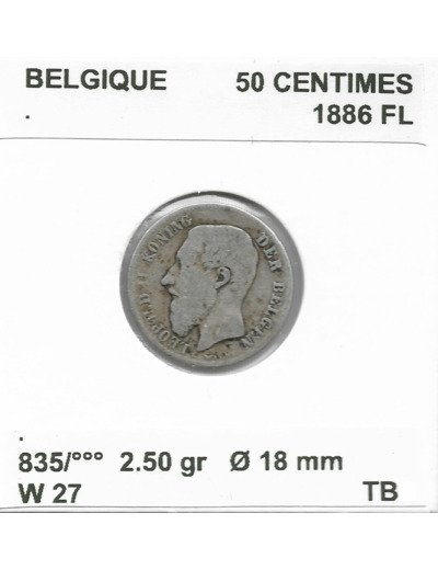 Belgique 50 CENTIMES 1886 FL TB