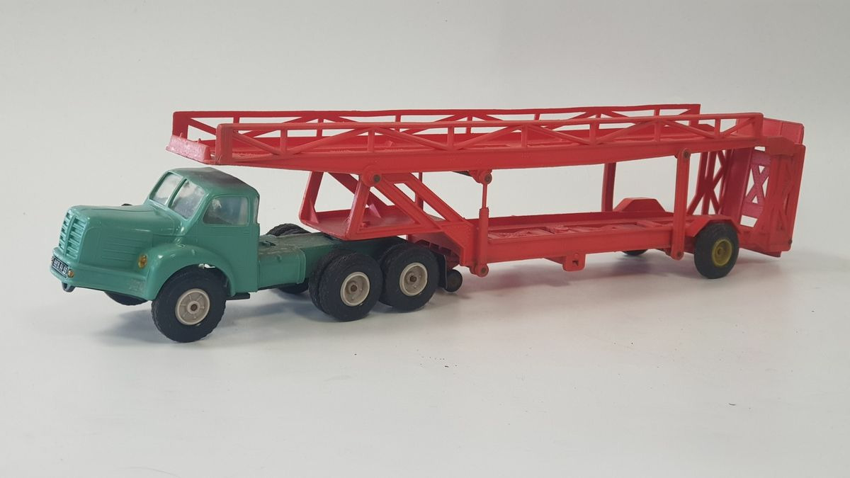 BERLIET TRACTEUR TBO 15 VERT AVEC REMORQUE PORTE VOITURE ROUGE NOREV PLASTIQUE 1/43 SANS BOITE voir état