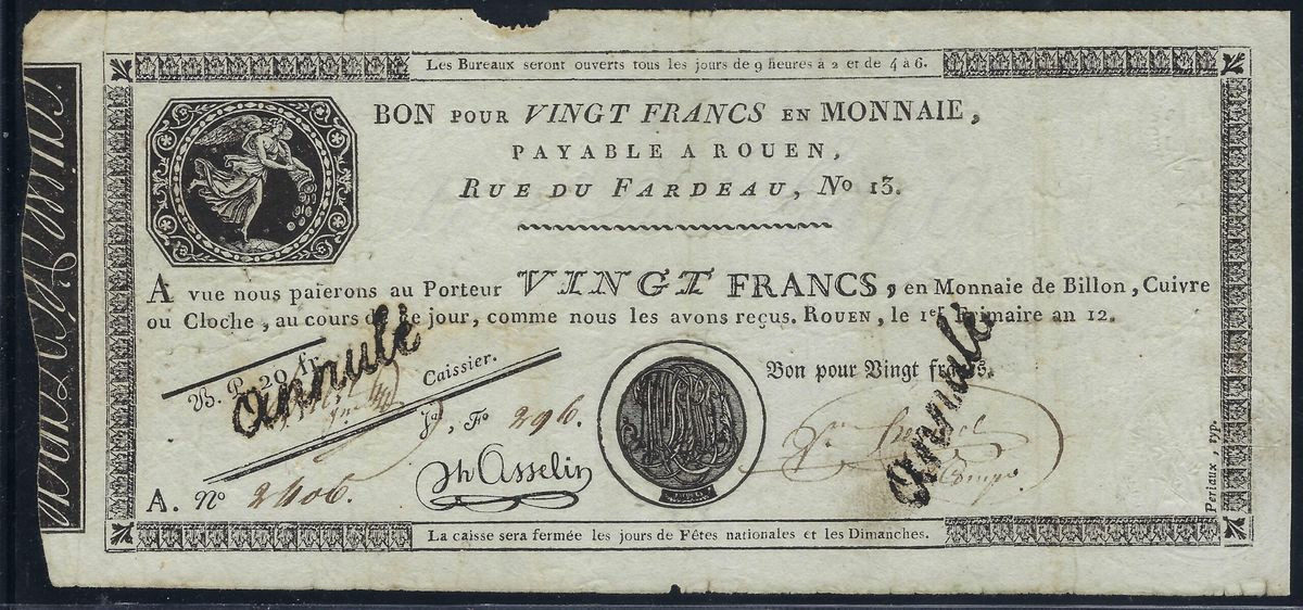 BON POUR VINGT FRANCS (Rouen) série A296 1er Frimaire an 12 annulé TB+