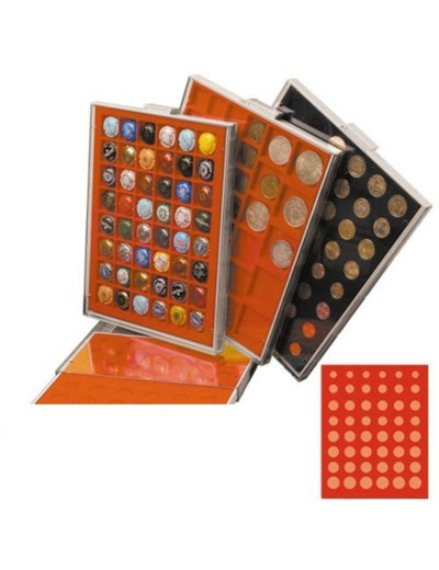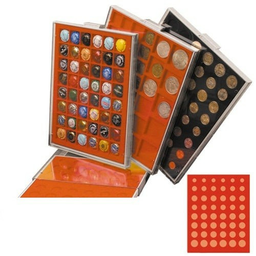 Tiroir gris, fond rouge avec 24 cases carrées pour monnaies jusqu'à 42 mm: Eagle, Kookaburra (Australien), Panda (China), Calgary 20 $, Silver $ small, US Silver $ large/Liberty. Format extérieur (L x L x H) 236 x 303 x 20 mm