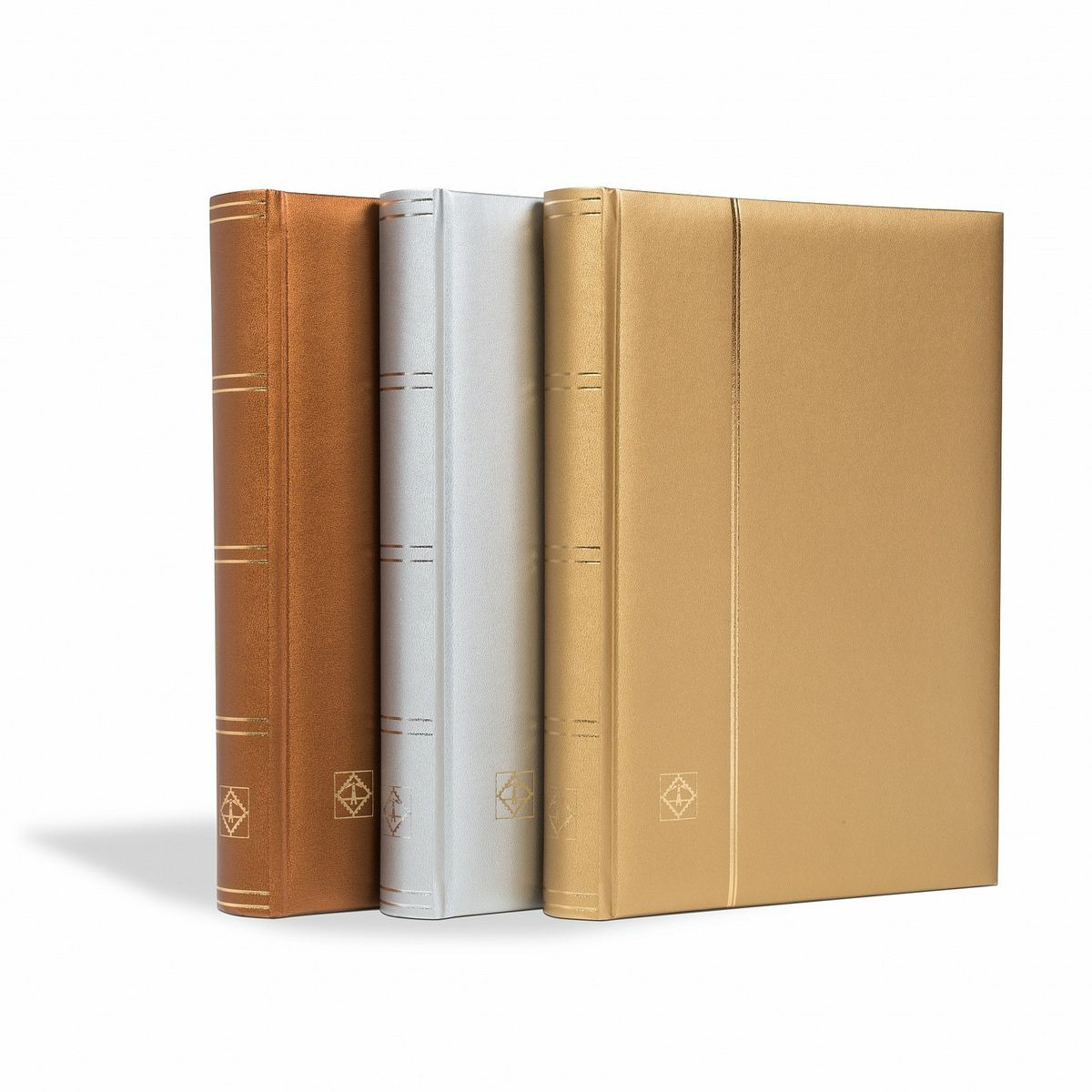 Classeur A4, 64 pages chamois, couverture ouatinée en façon métallique, avec impression couleur argent ou or, 9 bandes cristal par page, double intercalaires cristal, reliure à double articulation.