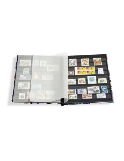32 pages noires, couverture non-ouatinée et colorée avec banderole montre des timbres du monde, 9 bandes rhodoïd ou cristal par page, double intercalaires cristal, articulation rigide