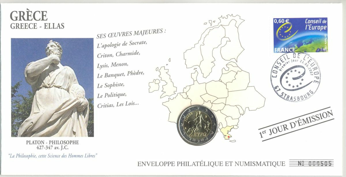 PREMIER JOUR ENVELOPPE PHILATELIQUE NUMISMATIQUE CONSEIL DE L'EUROPE 2 EURO GRECE 2006