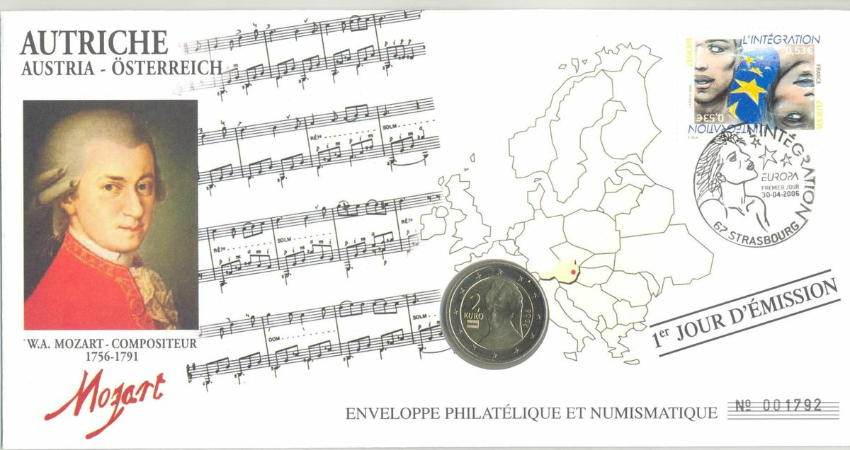 PREMIER JOUR ENVELOPPE PHILATELIQUE NUMISMATIQUE INTEGRATION A L'EURO 2 EURO AUTRICHE 2006