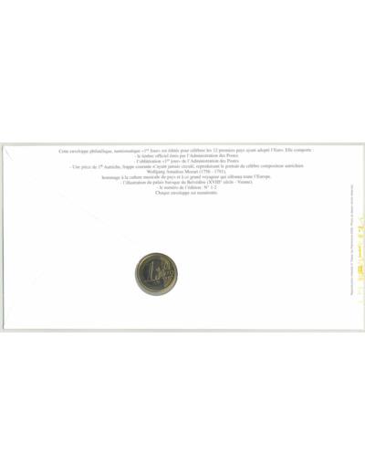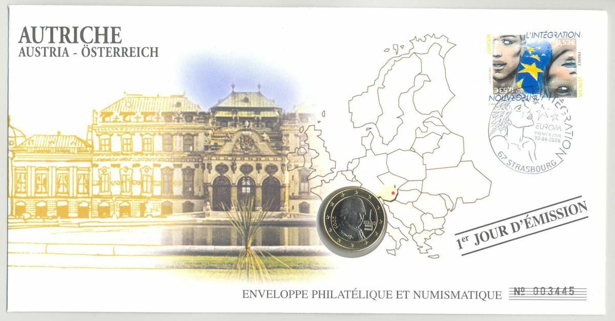 PREMIER JOUR ENVELOPPE PHILATELIQUE NUMISMATIQUE INTEGRATION A L'EURO 1 EURO AUTRICHE 2005