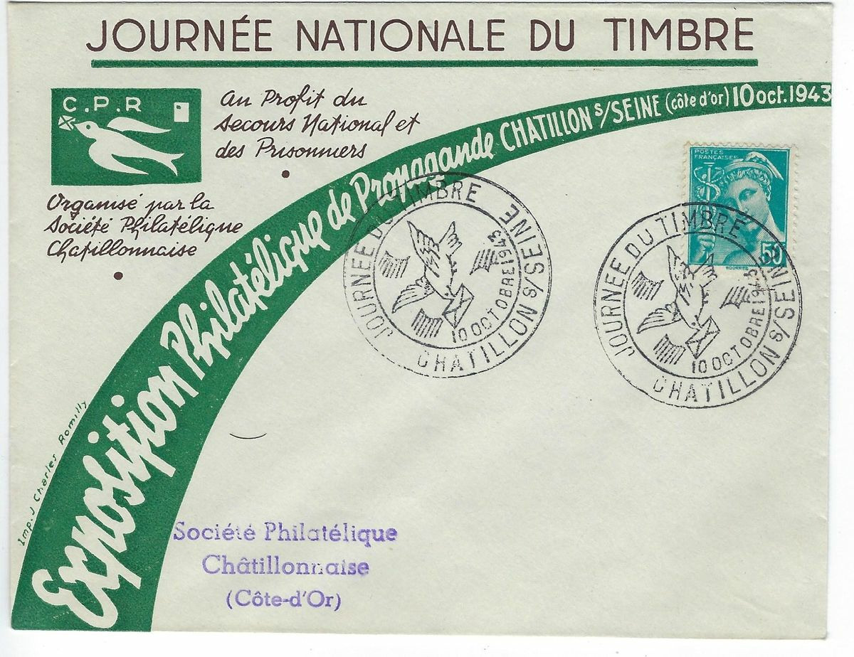 ENVELOPPE TIMBRE 50 CENTIMES JOURNEE NATIONALE DU TIMBRE 1943 CHATILLON SUR SEINE 10 OCTOBRE 1943