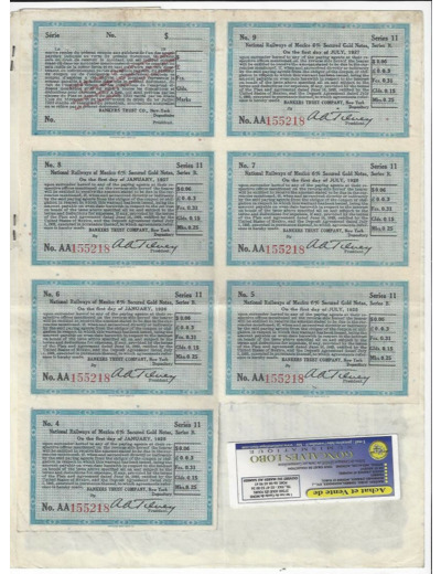 Ferrocarriles Nacionales de Mexico $2 US GOLD DOLLARS 1914 avec 7 coupons