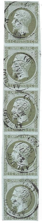 FRANCE 1 CENTIME OLIVE 1860 Yvert 11 bande de 5 timbres Obliterés sans trace de charnière