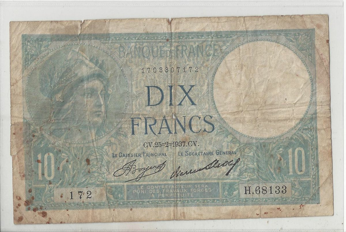 FRANCE 10 FRANCS SERIE H 68133 MINERVE 25 02 1937 B