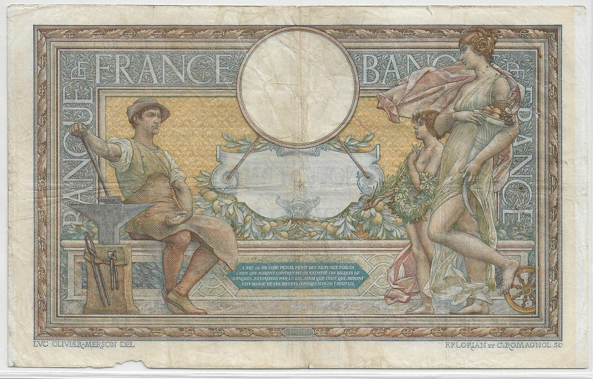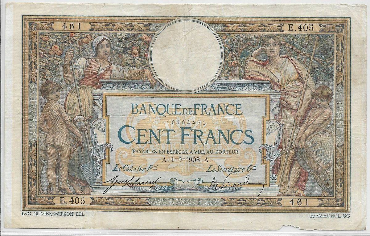 FRANCE 100 FRANCS MERSON AVEC LOM SERIE E.405 1-9-1908 TB+