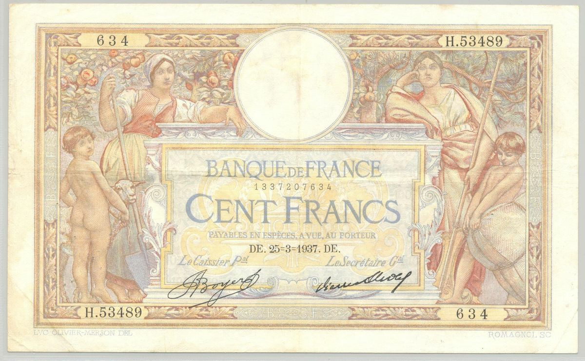 FRANCE 100 FRANCS MERSON SANS LOM SERIE H.53489 25-3-1937 TTB