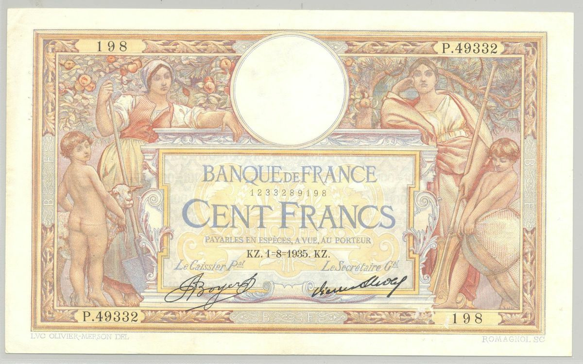 FRANCE 100 FRANCS MERSON SANS LOM SERIE P.49332 1-8-1935 TTB+