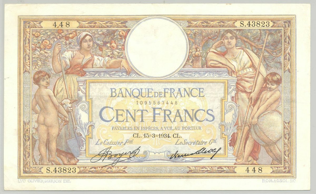 FRANCE 100 FRANCS MERSON SANS LOM SERIE S.43823 15-3-1934 TTB+
